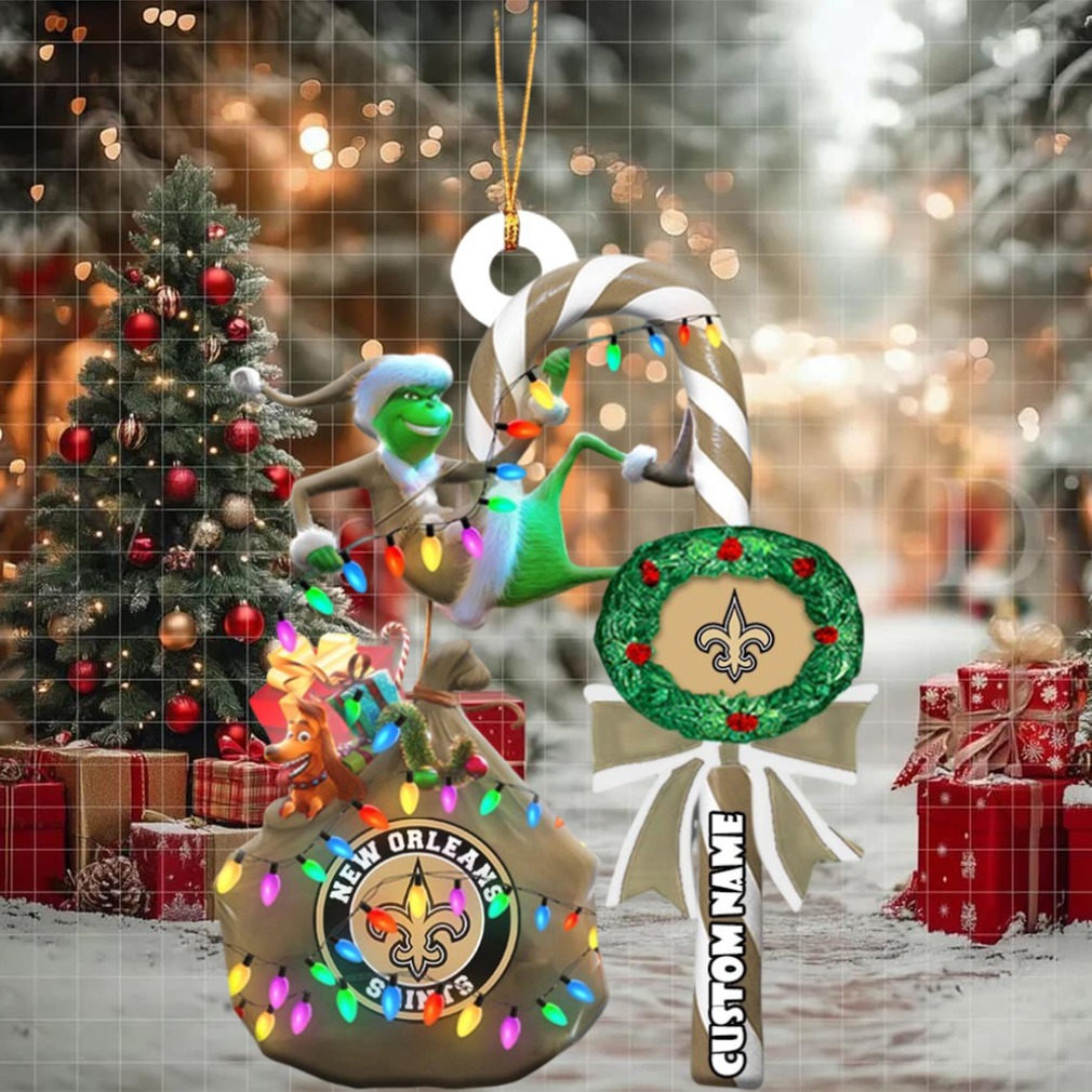 Who Dat?! Spread some holiday cheer and show your team spirit with this custom New Orleans Saints ornament. This unique Christmas tree decoration features the Grinch and a candy cane, and can be personalized with a name! It’s the perfect gift for any Saints fan this holiday season.