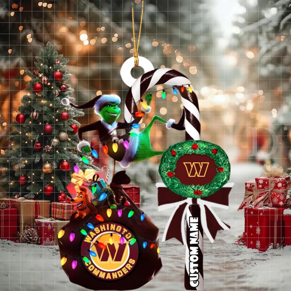 This NFL-licensed Washington Commanders Grinch candy cane ornament lets you showcase your team pride during the holidays with a personalized touch. Add a custom name to make it a truly unique gift or a special addition to your own tree. Made with high-quality materials, this ornament is designed to last for many Christmases to come, bringing joy and team spirit year after year. Its vibrant colors and detailed design capture the playful nature of the Grinch and the iconic Commanders logo.